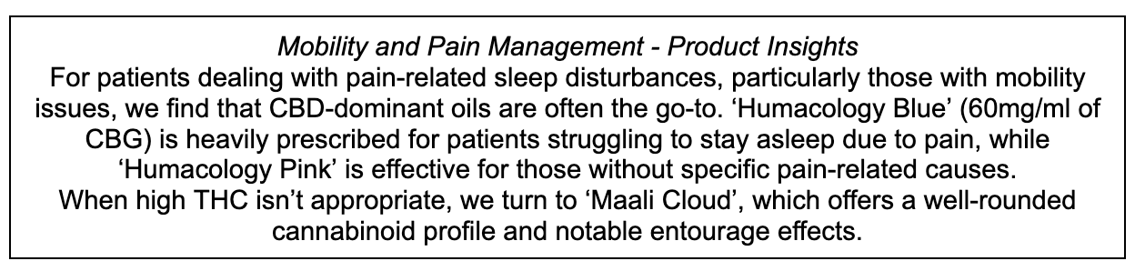 For many patients, especially those with mobility issues or low energy levels, I've found that sativa-characterised strains, particularly those with high CBG content, regularly provide significant benefits. In cases where pain is persistent, our team often recommends longer-acting formulations, like oils, to manage the background pain while using other fast-acting products for breakthrough pain.
