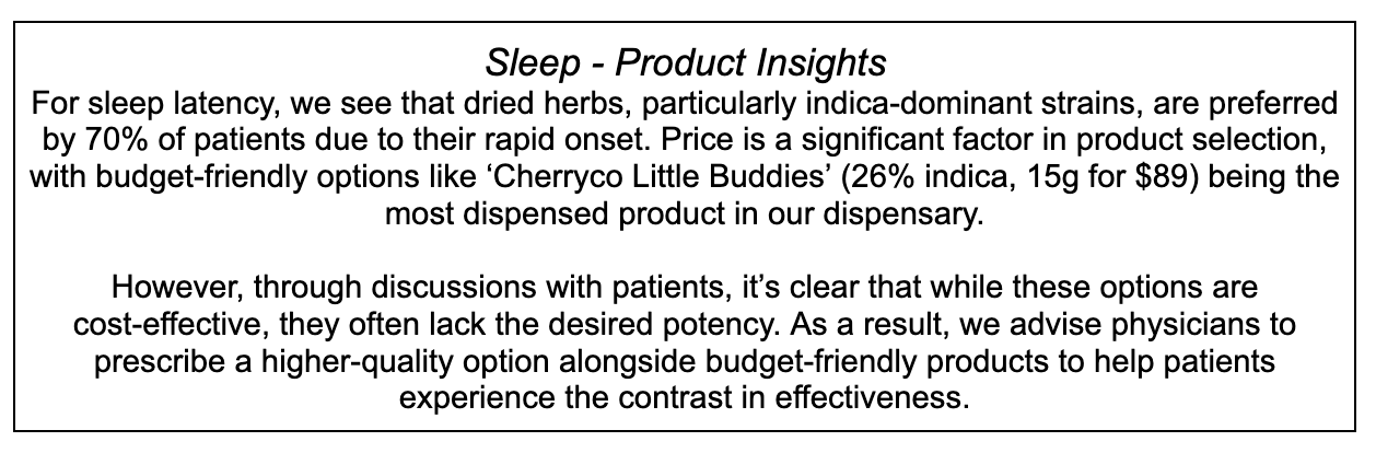 Product preference for patients with sleep latency issues shows that 70% prefer dried flowers, particularly indica strains, due to their rapid onset of action.